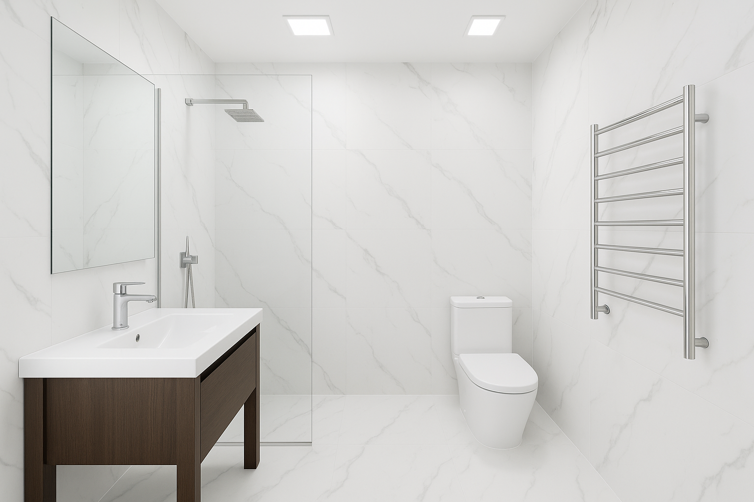 Es un baño moderno y elegante con un diseño muy limpio y minimalista. Las paredes y el suelo están cubiertos con porcelanato que imita mármol blanco con vetas grises naturales, creando un aspecto muy sofisticado.